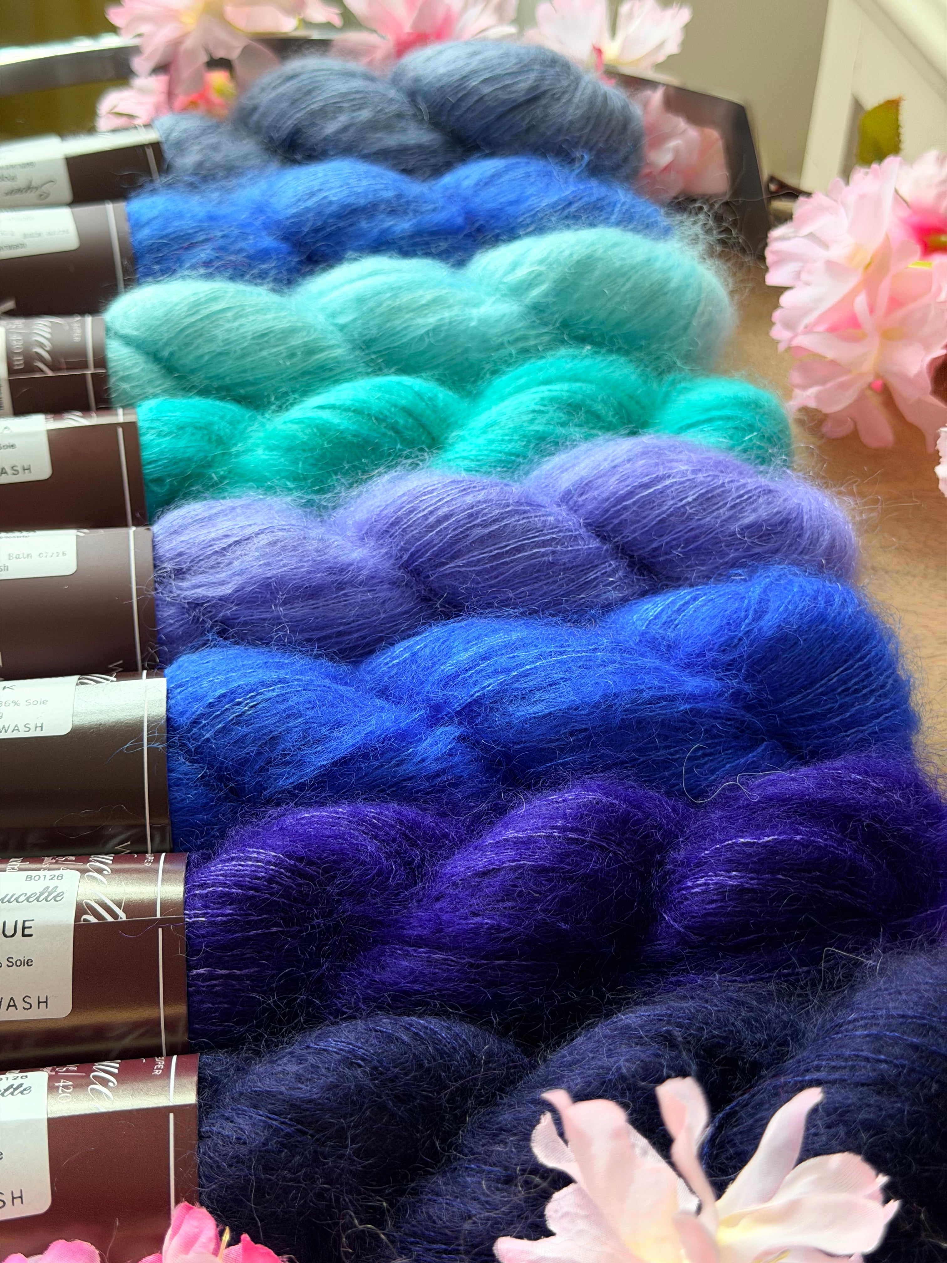 Chaque kit contient4 écheveaux teints à la main, jouant sur les contrastes et les nuances pour mettre en valeur le futur châle mystère. -